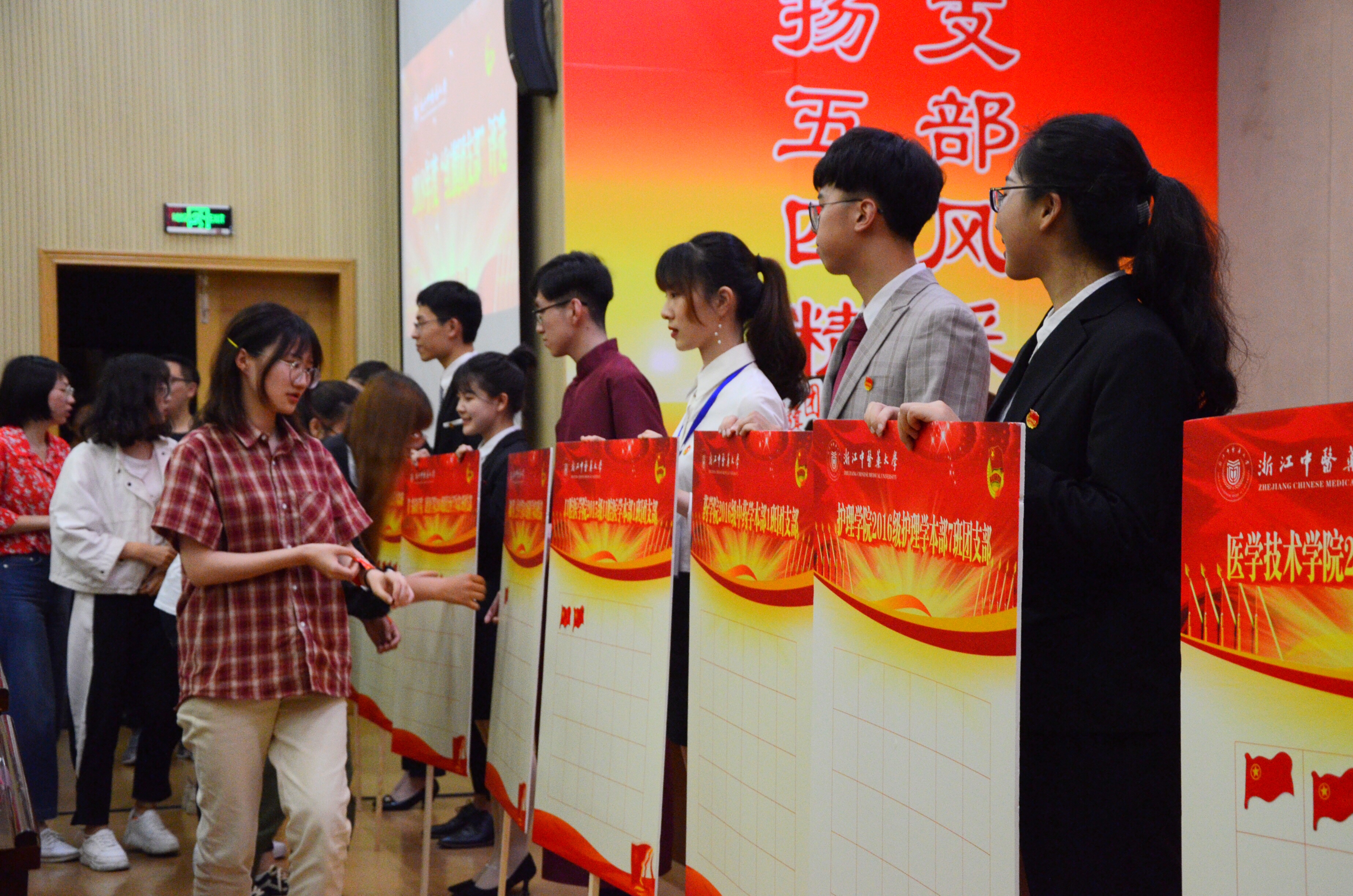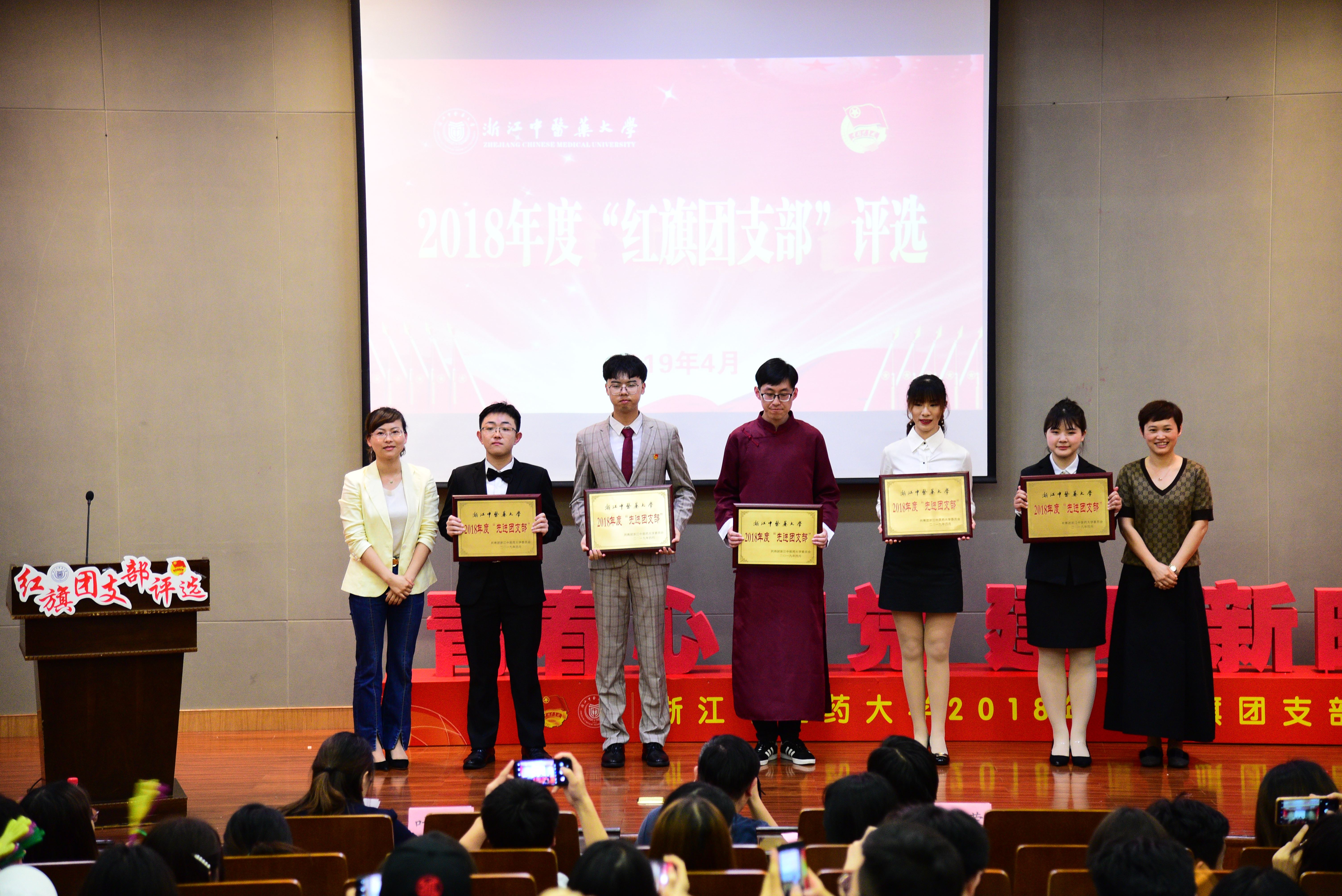 评比现场,10个候选团支部通过图文演示、视频展现、现场讲解的方式全方位展示支部风采,充分展现了我校基层团组织青春活力、团结奋进的精神风貌。本次评选结果由现场评委打分和大众评审打分2部分组成,经过综合评审,2015级中医学(五年制)滨江3班团支部、2016级临床医学本部4班团支部、2016级护理学本部7班团支部、2016级医学检验技术本部3班团支部、2016级市场营销滨江2班团支部等荣获2018年度“红旗团支部”称号,2016级康复治疗学本部1班团支部、2015级预防医学本部1班团支部、2015级口腔医学本部1班团支部、2016级中药学本部1班团支部、2016级生物科学本部3班团支部等荣获2018年度“先进团支部”称号。